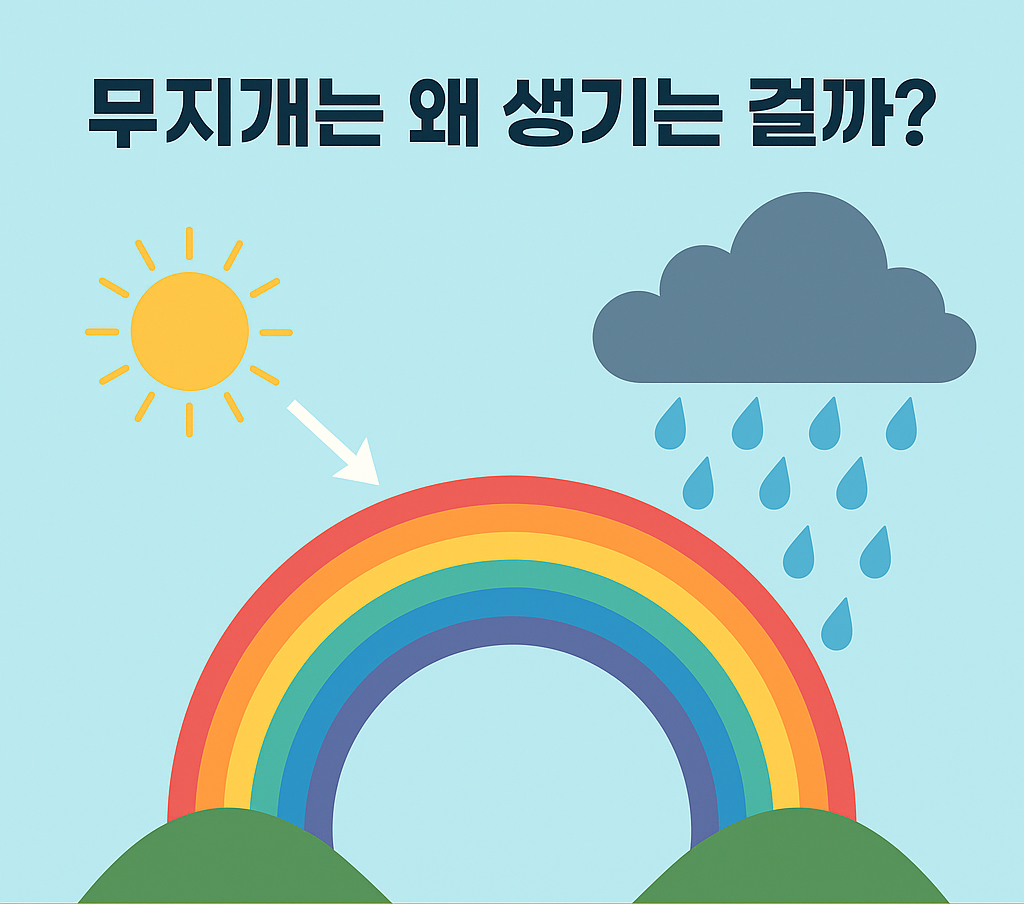 무지개는 햇빛이 공중에 떠 있는 물방울을 통과하면서 생기는 자연 현상이에요. 비 온 뒤 공기 중에는 작은 물방울들이 떠 있는데, 이 물방울이 프리즘처럼 작용하죠.