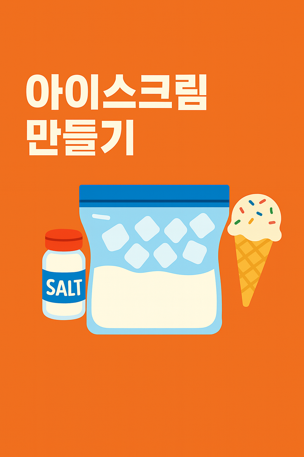 집에서 간단한 재료로 진짜 아이스크림을 만들며 냉각제(소금+얼음)의 원리를 배워보세요. 이 실험은 소금이 얼음의 어는점(융해점)을 낮추는 현상과, 얼음이 녹으면서 주변의 열을 빼앗는 과정(잠열 흡수)을 한 번에 이해하도록 도와줍니다.